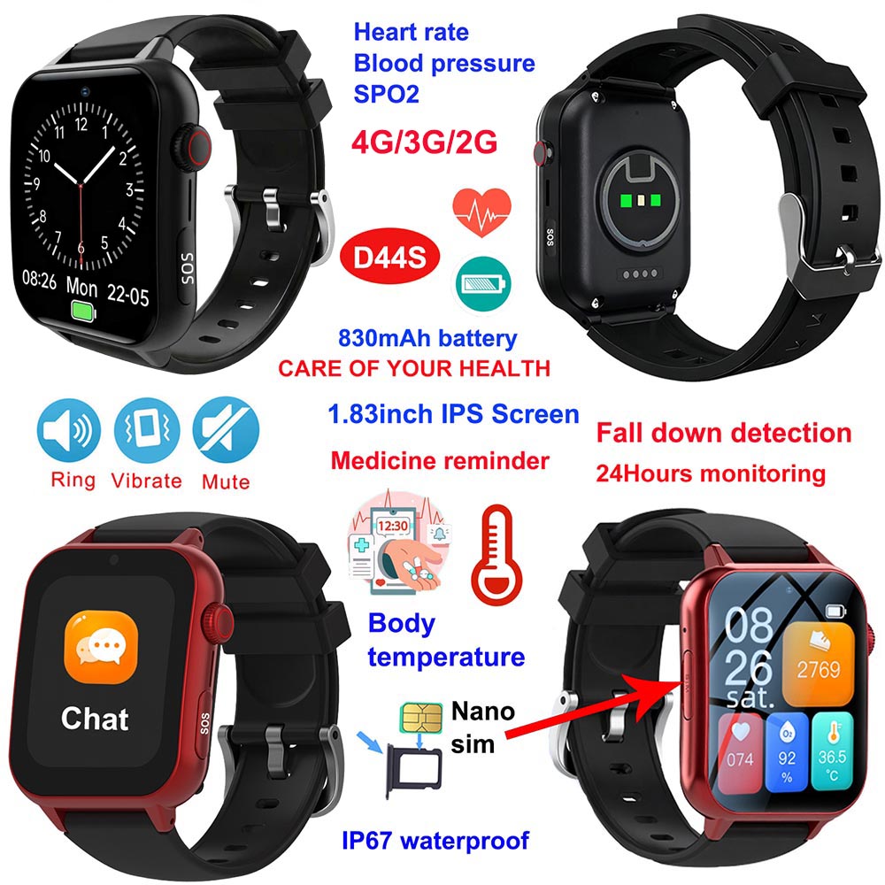 4G IP67 Waterproof Adult Senior Parents Radian screen Smart Healthcare GPS watch with Fall down detection and Heart rate/Blood pressure/ blood oxygen/Body temperature monitoring for Fitness Monitoring D44S (OK for Hajj, Pilgrims and Umrah safe tracker)