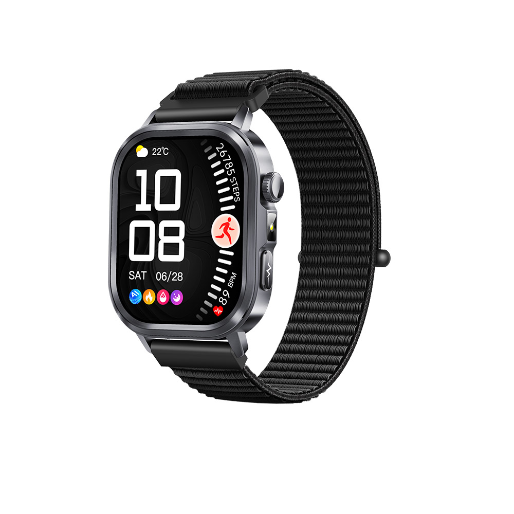 1.952-inch AMOLED full-touch screen with 410*502 high resolution, matched with nano ECG glass and always-on off-screen clock, delivering clear, vivid display and smooth, sensitive touch operation. Adopts premium alloy metal shell and plastic bottom case with black full light spraying; comes with silicone/braided dual-material straps and 5 color options, ensuring comfortable wearing and personalized matching for different scenes.